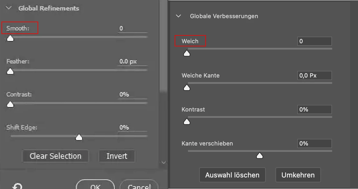 The first slider under Global Refinements is "Smooth" and is now incorrectly translated with "Weich". It is a possible translation, but "weich" means "soft, tender". The term is used correctly below ("Feather" translated to "Weiche Kante"), but the first slider doesn't feather the mask but straightens it out.