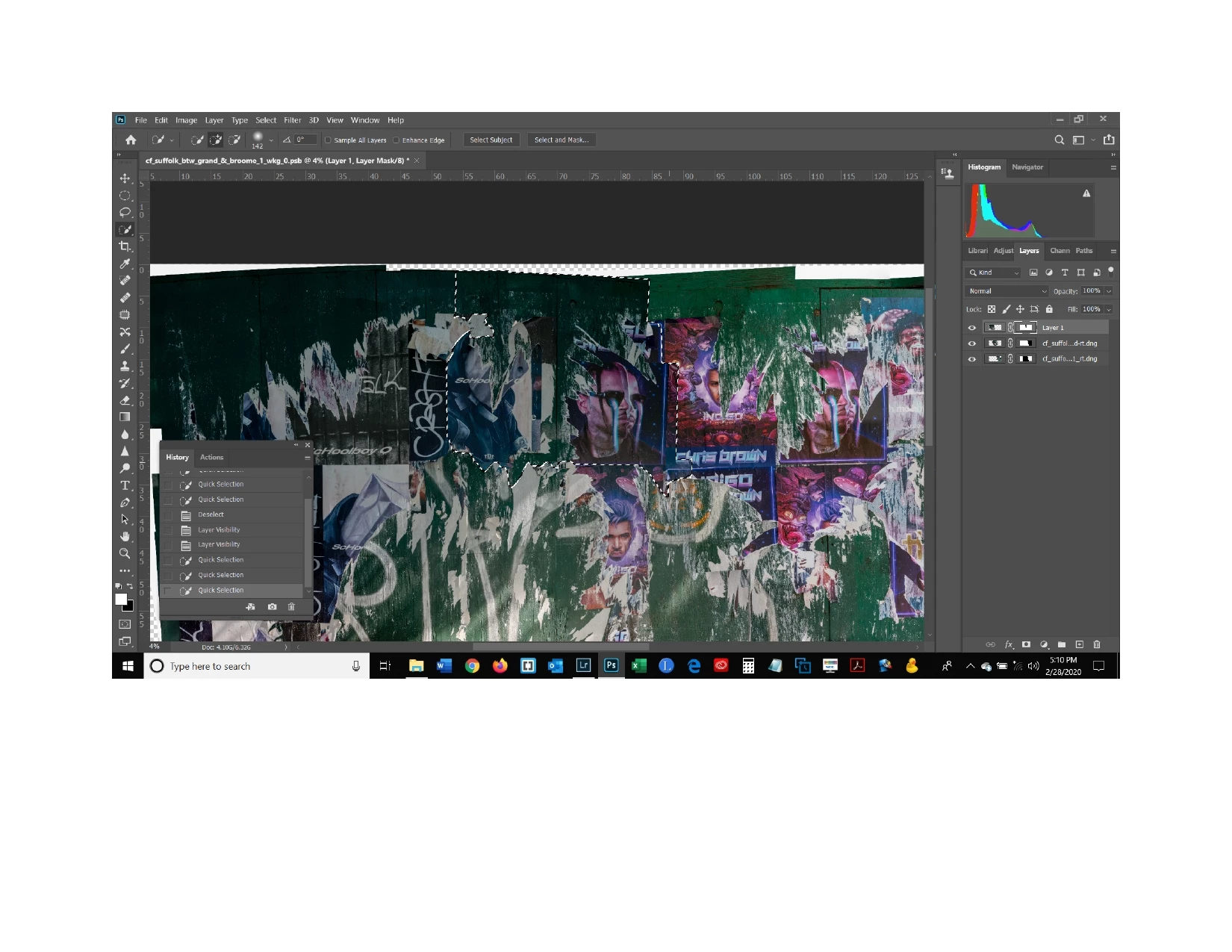 I created a mask that hid part of a layer allowing the layer underenath to show through as shown in the first screen shot. The mask is turned off so you can see the portion that I hid. Now I want to hide another portion of that same layer so that the layer undereath will show through - the selection shown in the second screen shot. I tried finding a solution by typing the words "how do you add a selection to an existing mask in a layer" and got the following answer: "Select the new objects and apply whatever refinements you require. Hold Shift and Ctrl (PC) or Cmd (Mac) and click the mask thumbnail. This will add the new selections and the original mask selections together. Now you can fill with black or white on the mask layer." But when I do that, it just makes the selection either black or white, it doesn't hide it. I think I would need to press Ctrl i in order to actually hide the selected portion (and not the rest) but that doesn't work either. So what am I doing wrong?