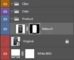 -Select the "Retouch Group" Smart Object, and move it into the "Product" Group