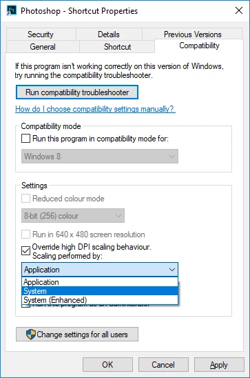 Try this, right click on the Photoshop shortcut and click on the Compatibility tab, put a check mark in the Override high DPI and select System from the drop down menu