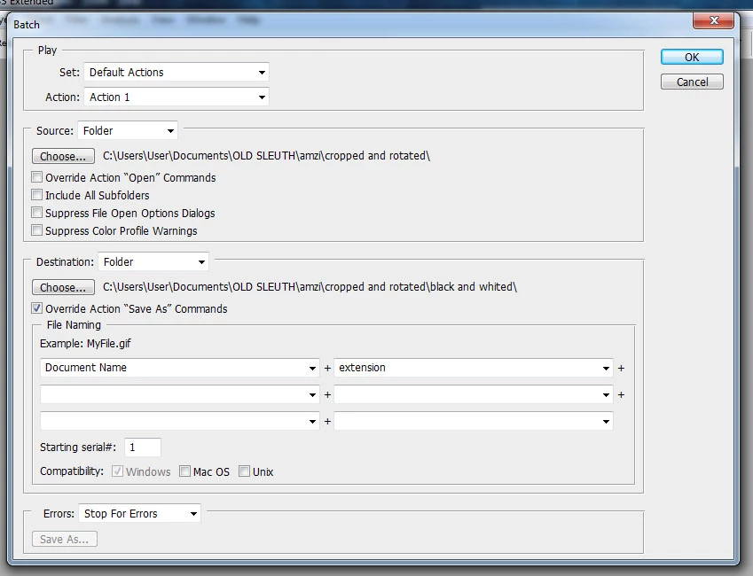 As seen in the image below, I need to batch process files that are in the "cropped rotated" folder and have the new files saved into the "black and whited" sub folder.