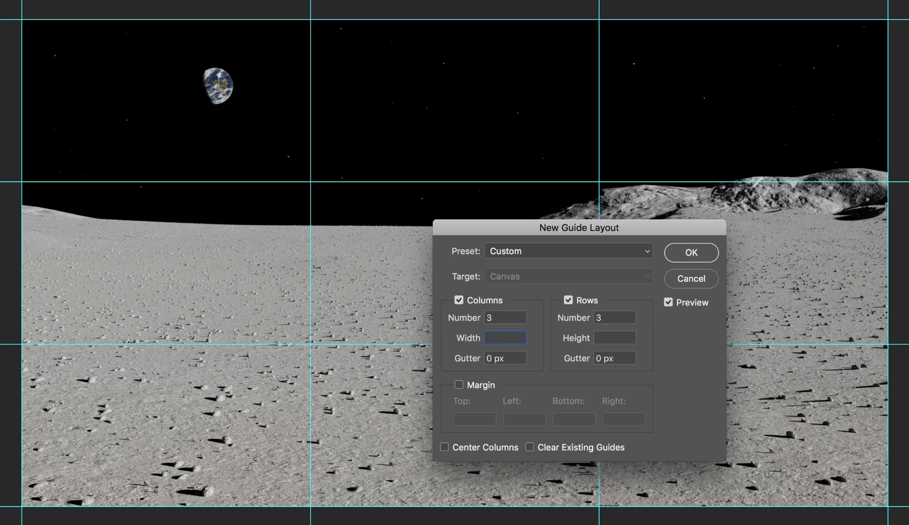 • View > New Guide Layout > 3 columns, 3 rows
