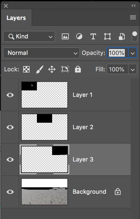 And name your layers — I didn’t. I would go with a spreadsheet syntax of either A1 B1 C1 or R1C1 R1C2 R1C3 for clarity. It will help if you need to multiple-select layers later and nudge a column or row with the arrow keys.