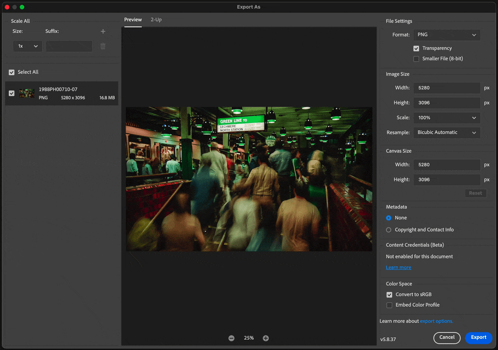 4. You might want to select Copyright and Contact Info if that metadata is already entered in the image and you want that info to be included with the exported copy.