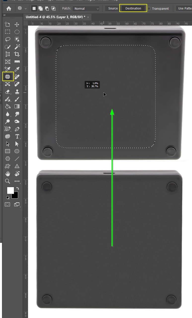 Drag the selection to the blotchy original, and release the mouse, and the Patch Tool will blend it in.