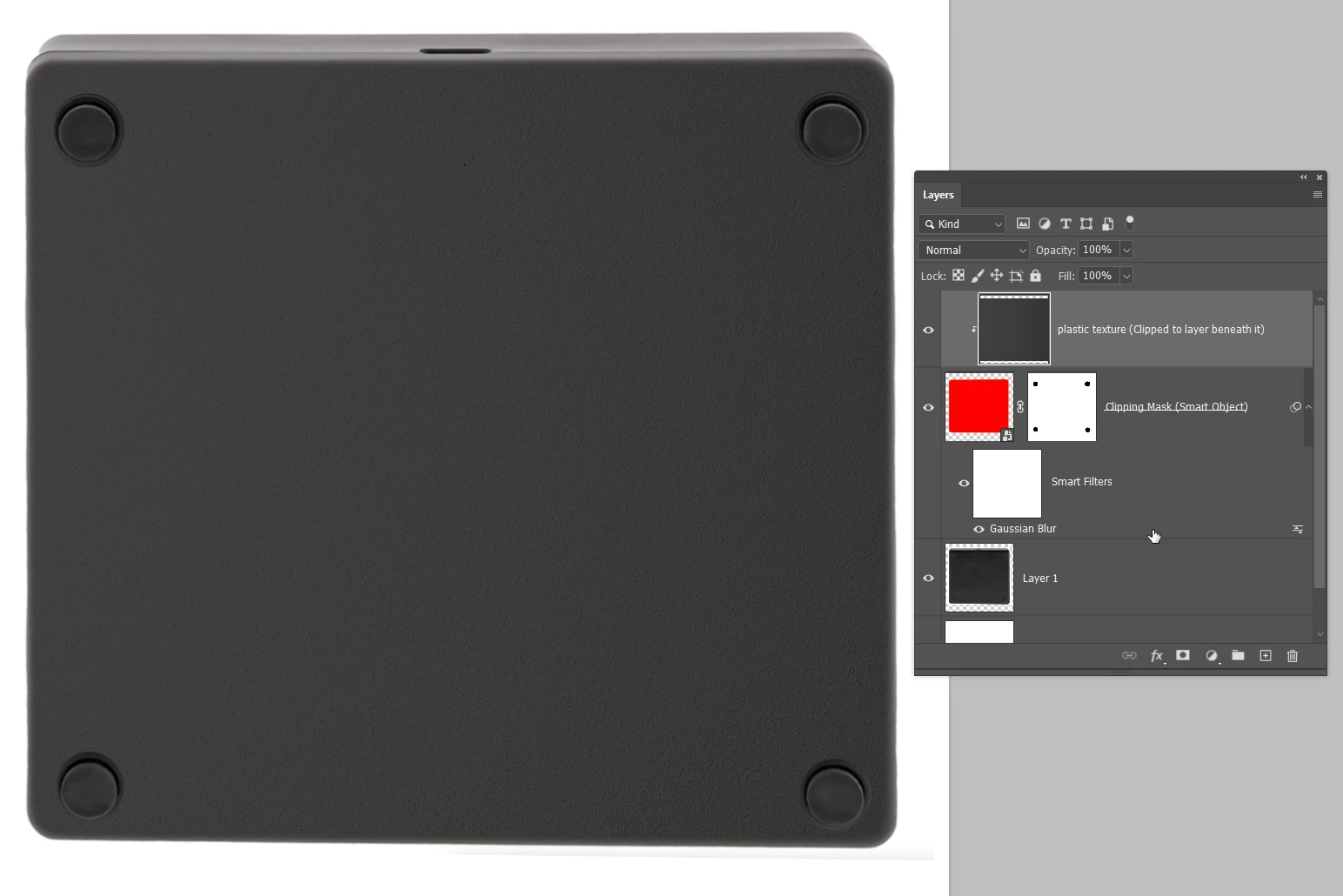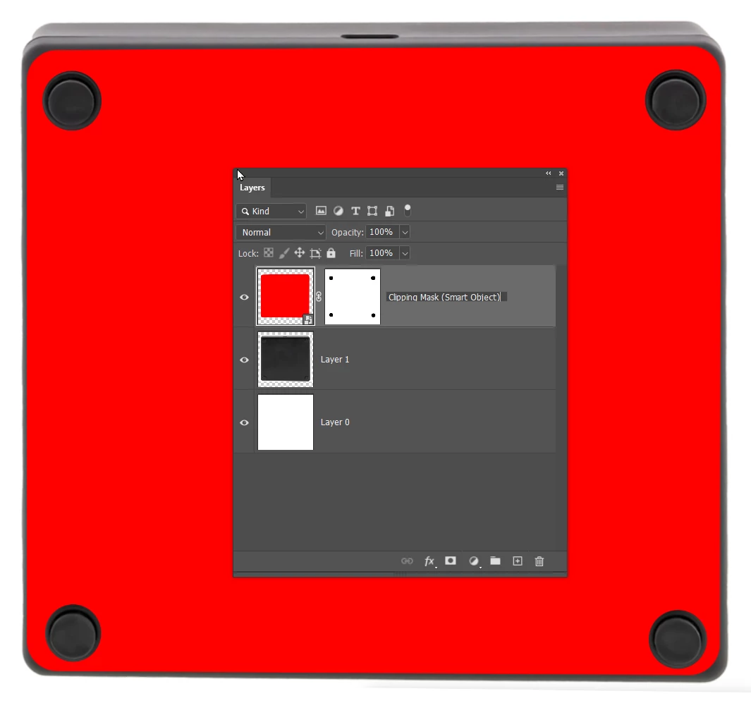 Add a rectangle layer to cover the base (because it is easy to create the corner radii) and make it a Smart Object so we can fine tune the fit and add effects. Colour is unimportant as it is just a clipping mask. Add a layer mask to reveal the feet.