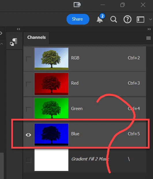 When making a mask it's useful to look at the individual channels first. Sometimes one channel has very good contrast to begin with, so that it makes a good starting point for making the mask. Here it happens to be the blue channel, but it could just as well be red or green.