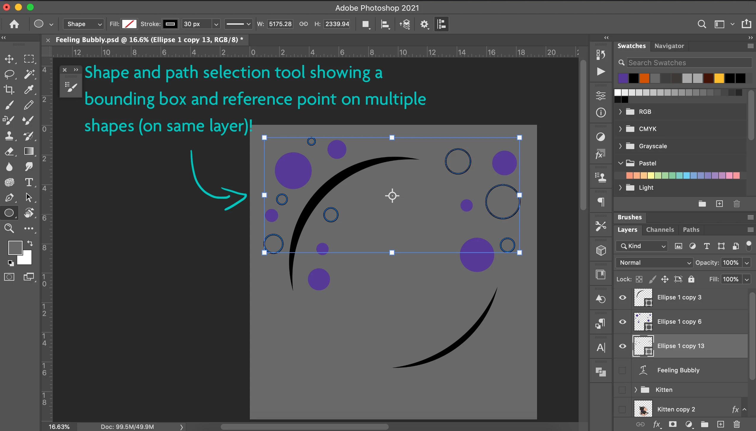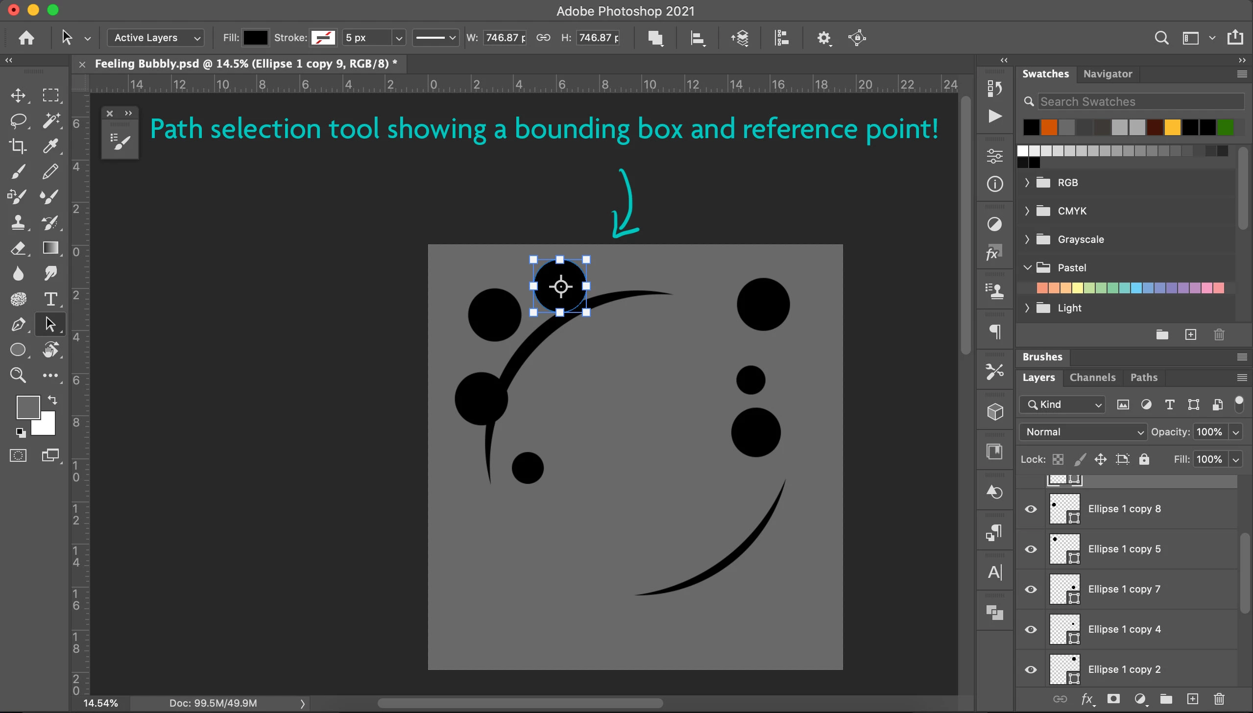3 - The shape tool behaves like the path selection tool - instead of showing only the thin blue path around the shapes, it shows a bounding box and a reference point.