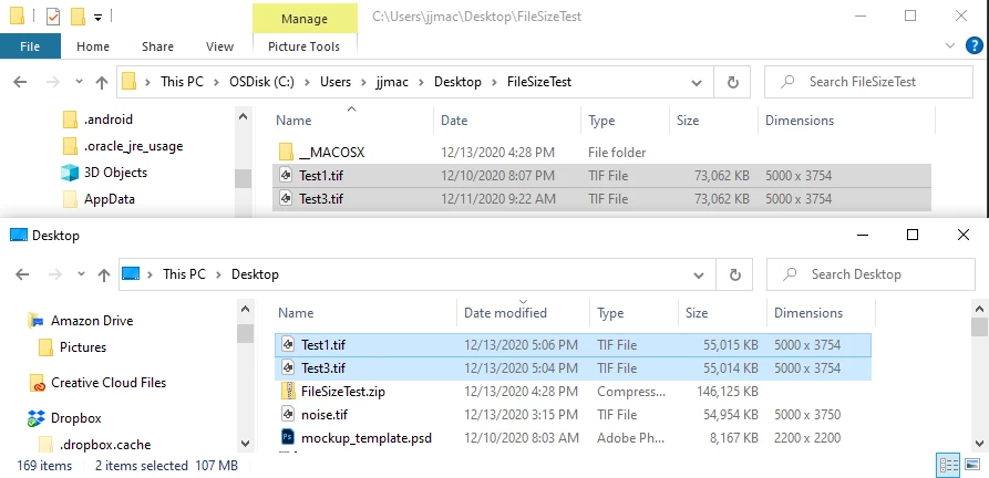The confusion arises because the listed file size differs depending on whether I view the image in Photoshop, as a Bridge thumbnail, or in the Finder (via Get Info). See attached screenshots.