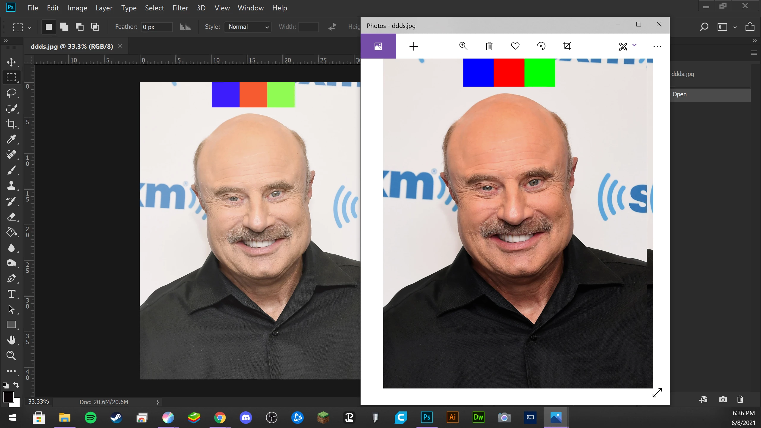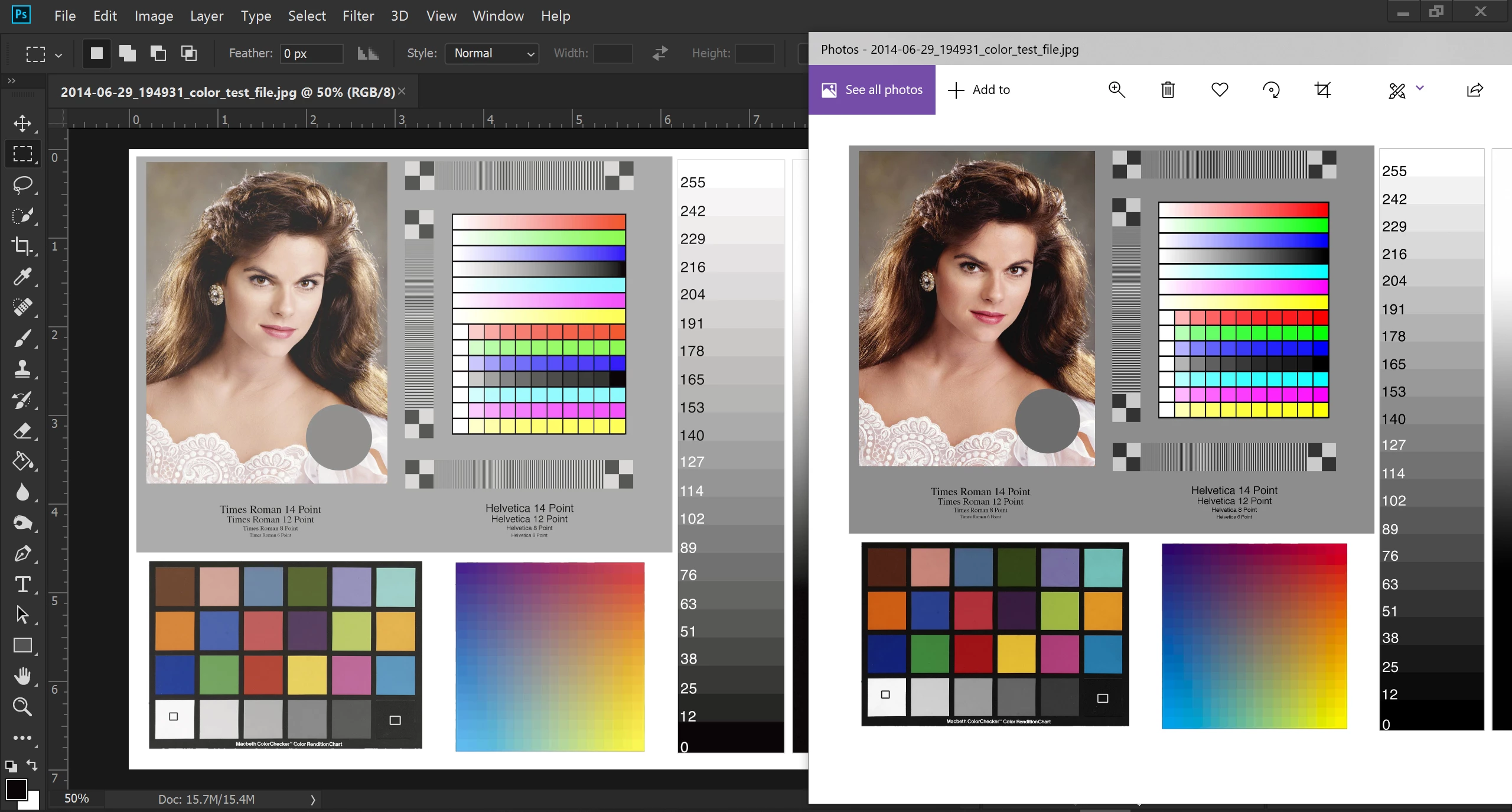 So is it wrong for me to expect images I look at say using Windows Photo browser or even Chrome not to look identical or at least close to the same when working on them in Photoshop using the sRGB color space? Because they don't, and it's driving me crazy. Images in Photoshop look more desaturated, and maybe a tiny hint of yellow. When I export it using the sRGB profile, and then open it anywhere else, it's pretty good. Why does this happen if my display is nearly 100% sRGB? I'm so confused on what is happening, and how to fix it, if it even can be fixed. Here is a side by side of what I see in Photoshop, vs what I see in Windows Photo...