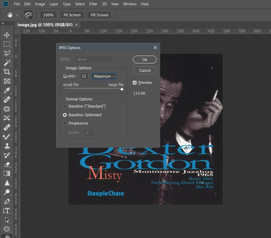 Can I set JGP compression choice in "save as" dialogue to be "baseline optimized" by default?