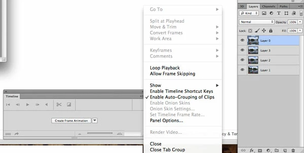I have looked at multiple tutorials saying that to create an animated gif in Photoshop CS6, you just open the Timeline palette and select "Create Frames from Layers" from the dropdown. I don't see this option, not even grayed out. What is the problem?