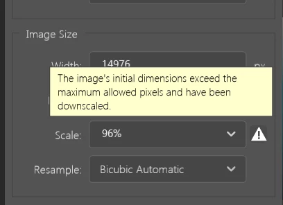However when I try to export my image of 15600 x 9000 pixels it scales to 96% and won't allow me to change it stating that the inital dimension were too large.