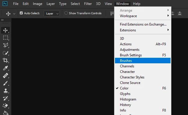 Go to the Window menu and select the Brushes from there