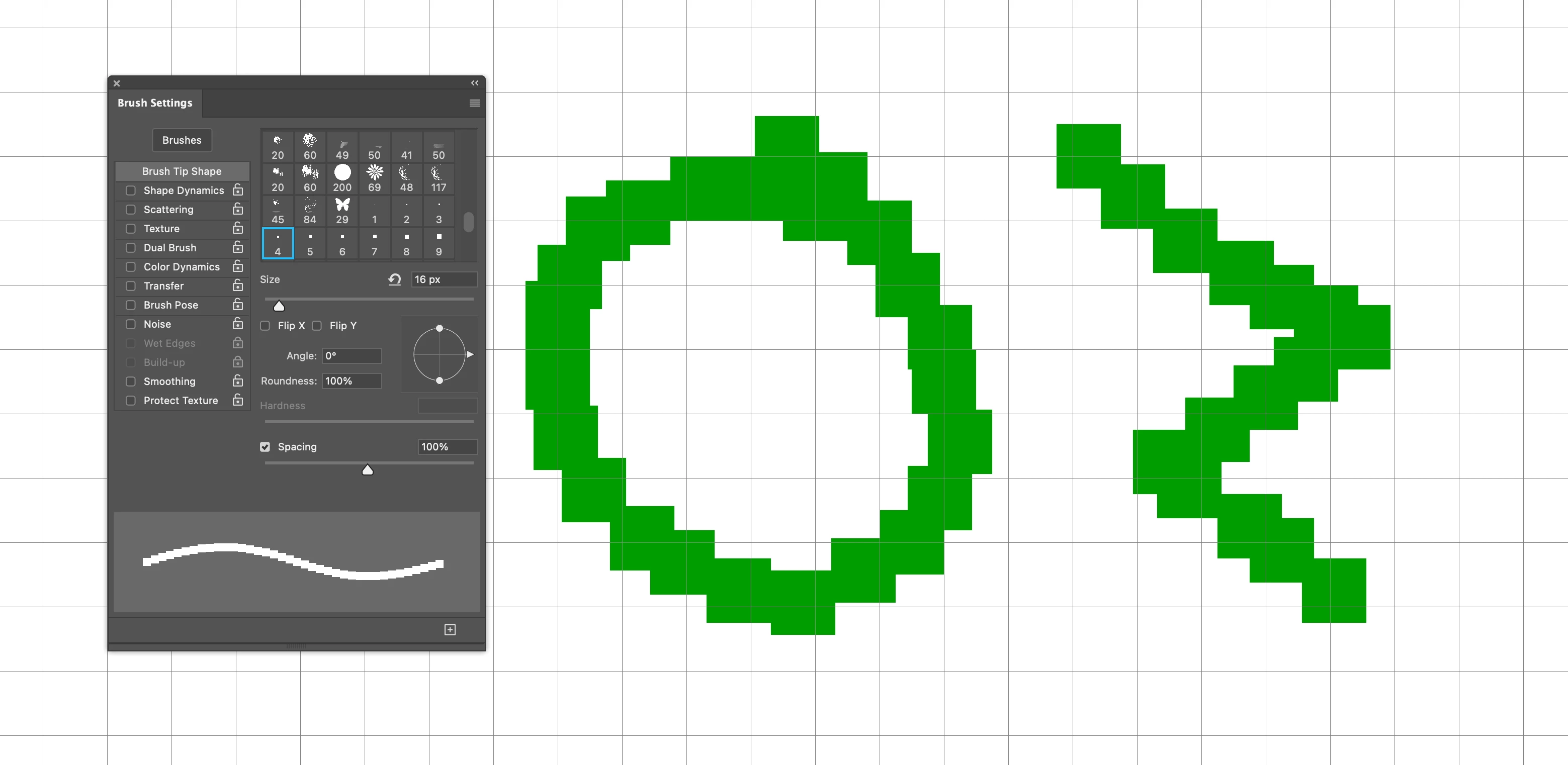 As an example, I have a square 16x16 pixel brush with a 16x16 pixel grid.
