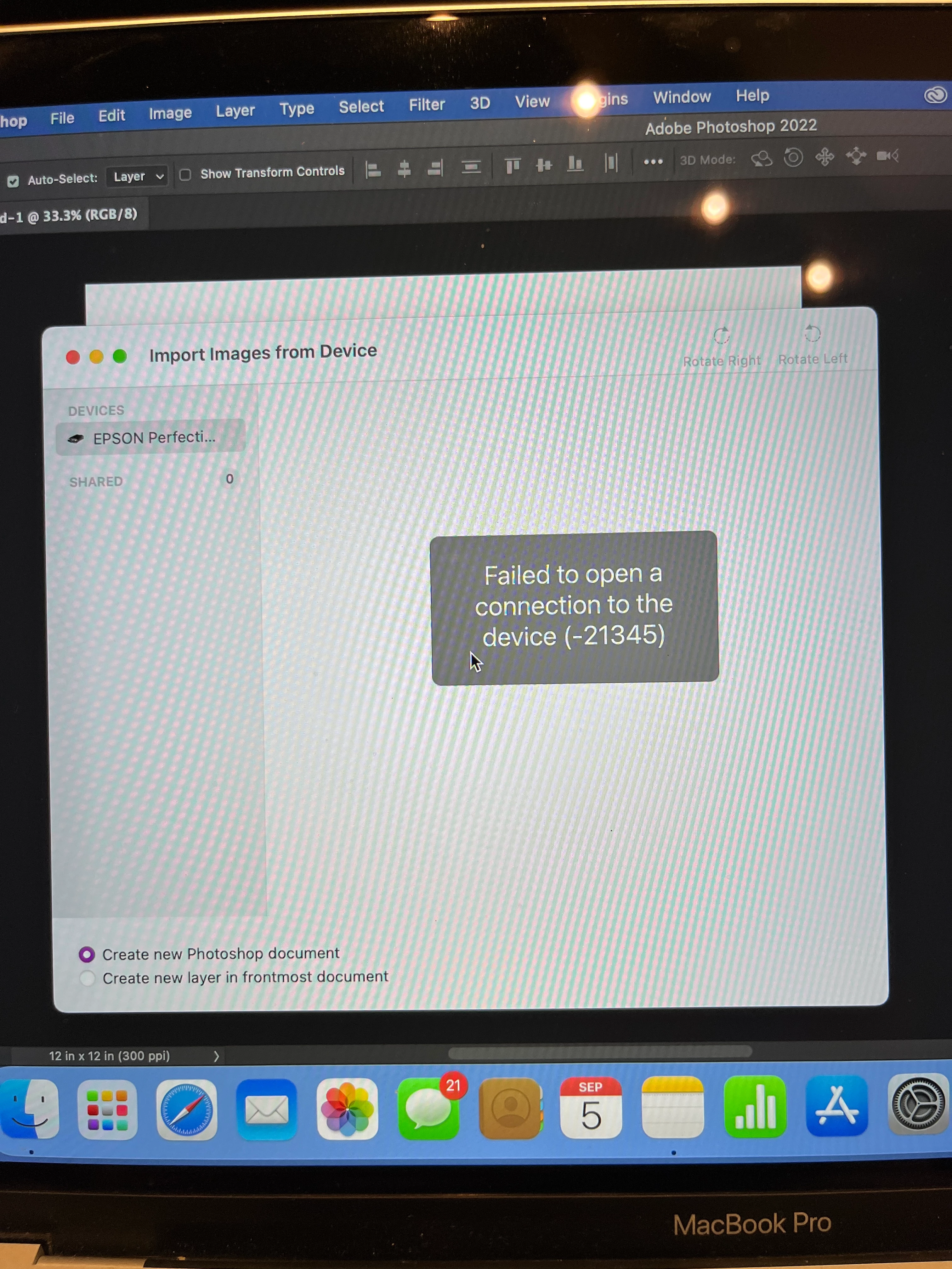 I am trying to scan my art into Photoshop using an Epson Perfection V600 Photo scanner. I have had the scanner for several years and it works fine just scanning files into the computer. Just recently, I installed photoshop on my Macbook Pro. When I try to scan directly into photoshop I get a message that says "Failed to open connection to the device (-21345). See photo. I did upload the latest driver from Epson. It still says the dame thing. Does anyone know a fix for this? Thank you in advance.