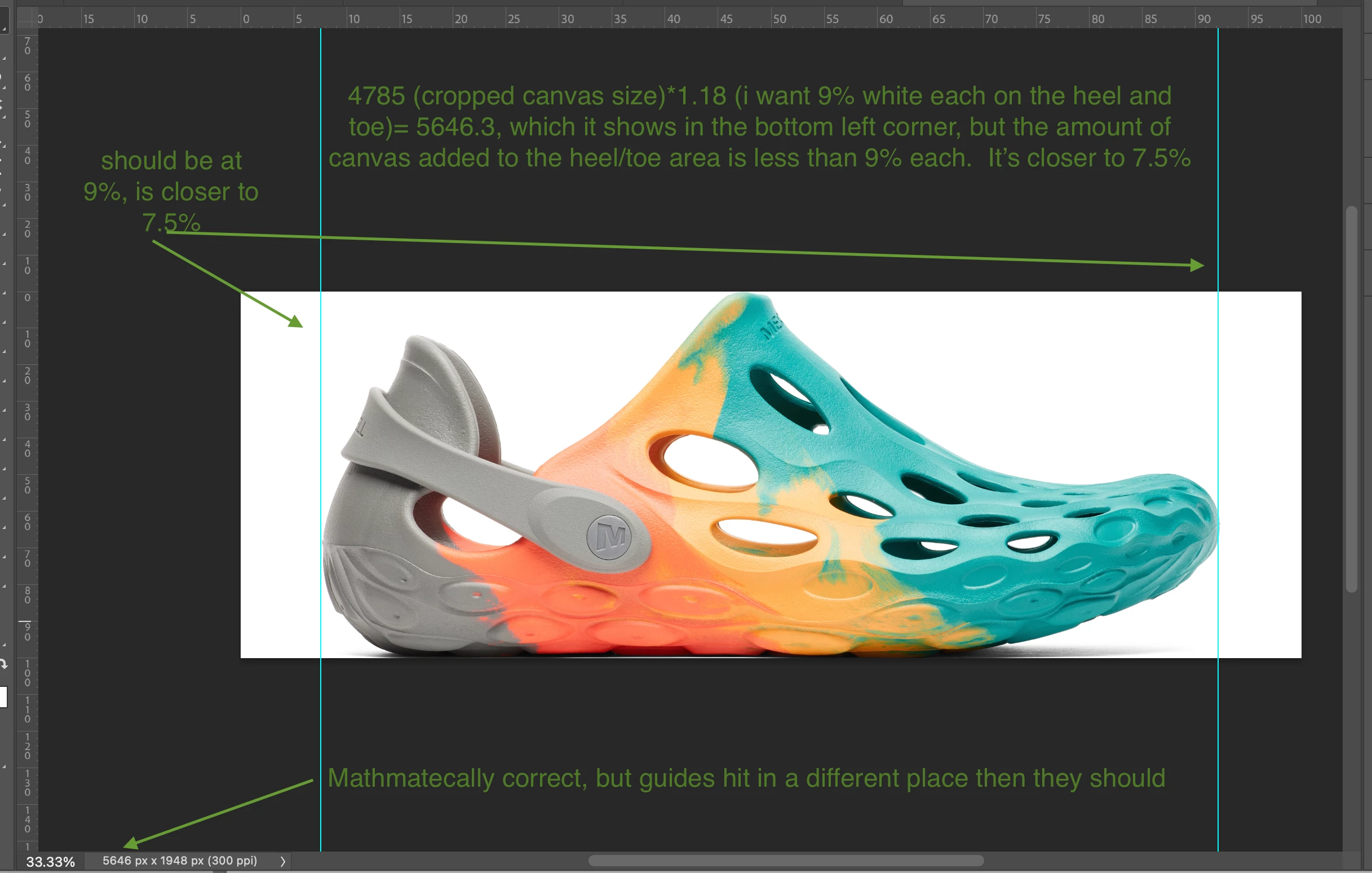 I feel like I'm crazy. I am cropping tight to a shoe, then expanding 118% so there will be 9% white margin on the heel and shoe. When i do this, either by canvas width increasing 118% or by checking the relative box and choosing 18%, I get a margin that is closer to 7.6%. If I do the math and increase it by pixel size instead, the same thing happens. The canvas size shows that it's correct, but the amount of margin that grows is incorrect. This happens on PS 24 and 23, chat was no help, fresh install did nothing either. Someone help me understand how i am doing this incorrectly.