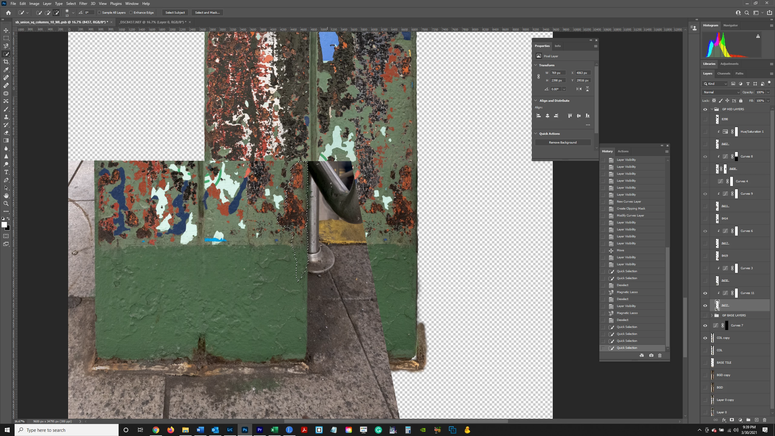Marching ants don't show up in a screenshot but here's what I want to do: In the image below, Layer "8437" is selected. I made a selection of the right hand side of the column, excluding the background. I wanted to clone stamp the right edge of the column onto the right edge of the "COL copy" Layer immediately below it. I made the selection so I wouldn't take anything else but the column when clone stamping onto the column in the COL copy Layer.