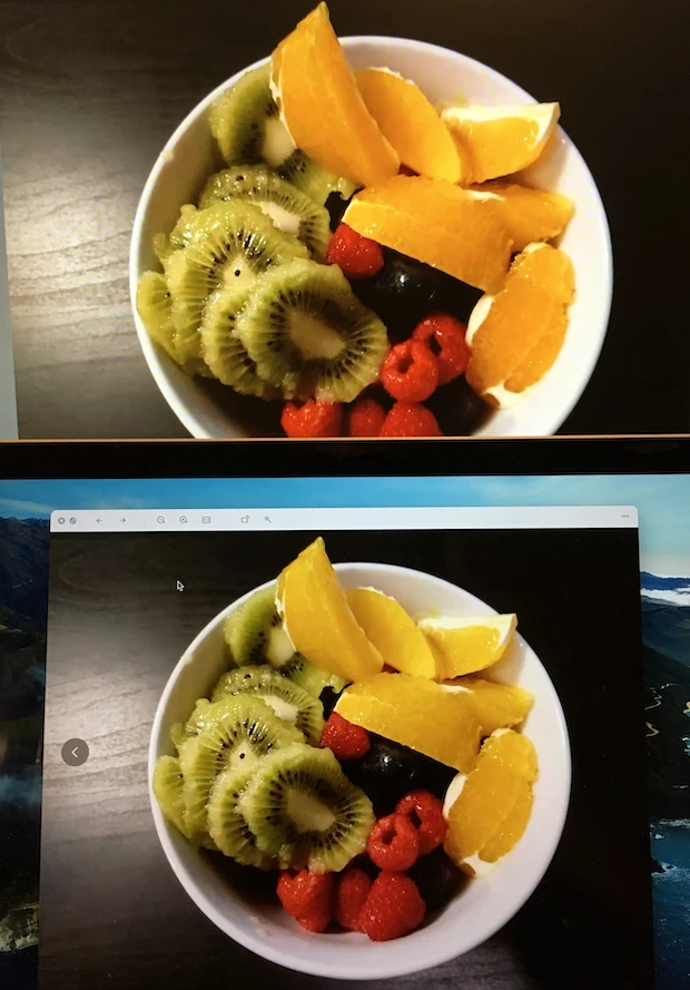 [By the way, a display screen should be viewed in rather subdued light, objects [your fruit] (and prints) should be viewed in good daylight. SO unless you have a daylight 'light booth'* you CANNOT hold up items next to the screen and look for a match. IF the light it bright enough to illuminate an object, then its way too bright for proper viewing of the display screen.