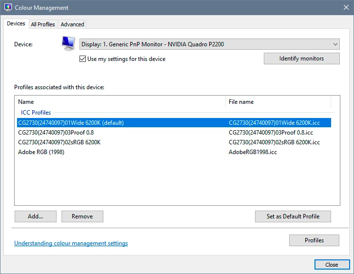 Open the Windows color management dialog (type it in Search if you don't know where it is), take a screenshot and post it here: