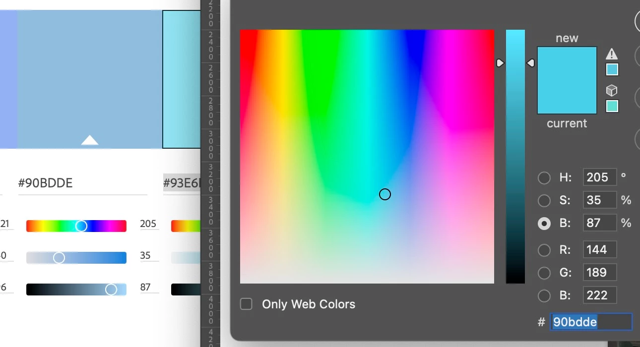 I’m trying to capture a color from a swatch on the Adobe Color website. The Mac color sampling tool, "Sip," says the color on the Adobe site is 90BDDE (agreeing with what the web page says), and it says the one in the Photoshop foreground is 94B8D8.