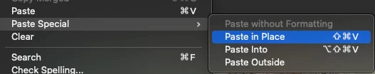 Hi @Kailyn31133426rqfo When you paste go to edit and choose Paste Special>Paste in place.