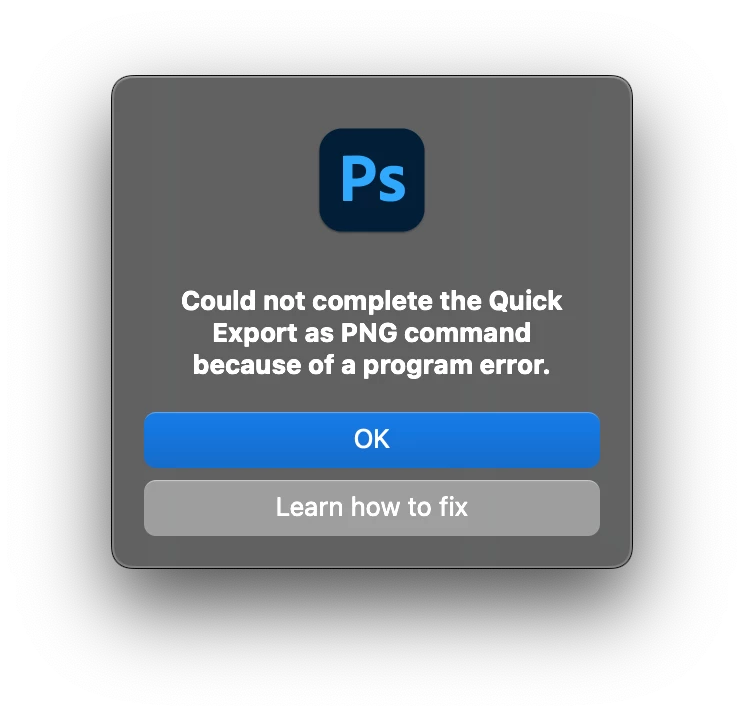 Every time I try to export as png, or export as, I get this error message. Additionally, when I start photohsop I am met with an empty screen, and cant access the home workspace. I have upgraded everything, uninstalled and reinstalled, updated my computer, everything. This happens randomly every month or two and lasts for a few days to a week. Can't seem to find any info how to fix this, and the only option seems to just wait it out.