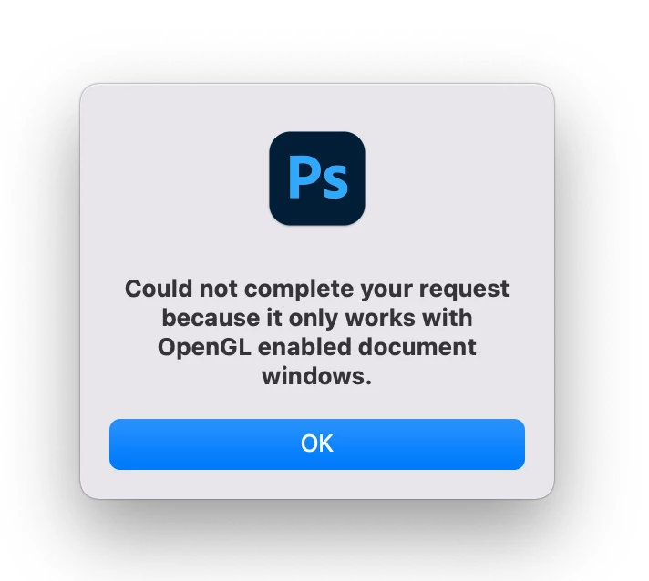 Could not complete your request because it only works with OpenGL enabled document windows.