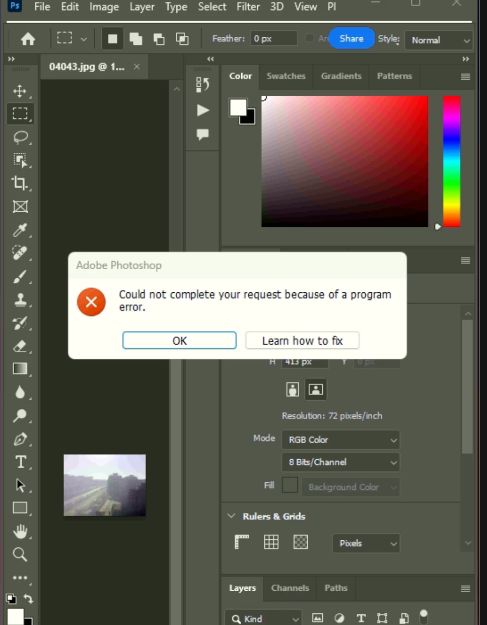I ran a batch automation editing in my Photoshop 25. and got the below error after it edits some photos and then the batch automation stopped working. How can I fix this issue?