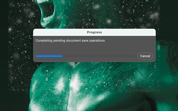First I click on Cmd+S to start saving the doc (bottom left corner Saving % is slowly progressing) > Creating a new stamp layer and converting it to Smart object > a dialog box with the forward moving progress bar appears in the middle of the screen and is stuck there between 1 and 2 min sometimes even (much) longer (see screen shot), depending how big the saving file is.