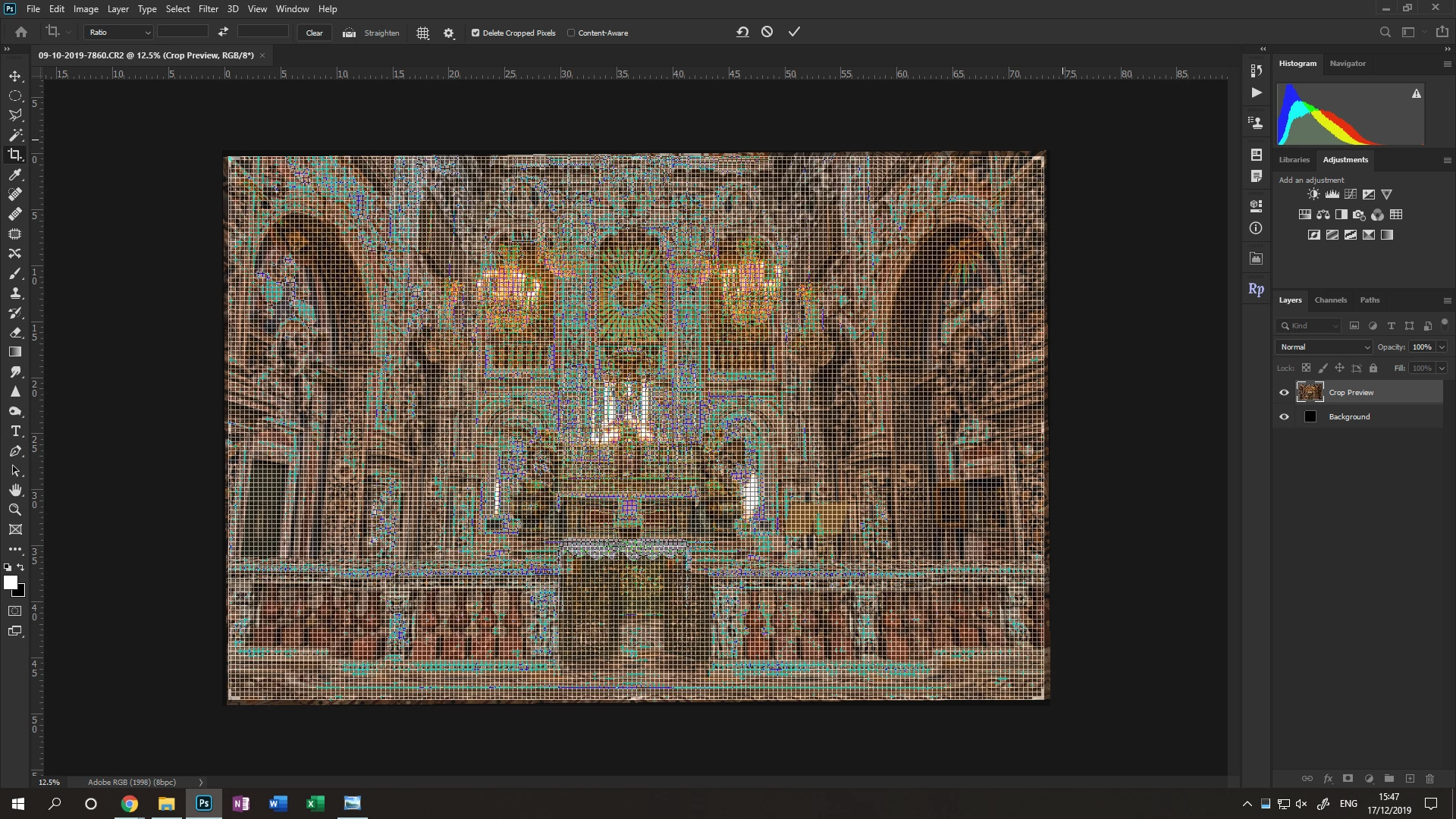 I'm hoping someone can help. Since the last Photoshop update I am having an issue with the crop tool overlay while straightening my photos. When I click on the corner of the image to drag to straighten the photo a fine grid overlay appears and make sit very hard to see the image while I am trying to straighten. I have attached a screen shot to show how bad the grid is.