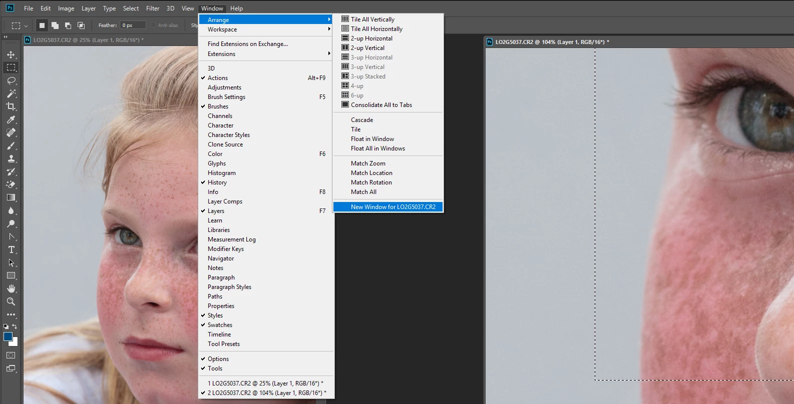 I want to open two windows of same document in Photoshop to do comparison of two layers. I want this to happen.