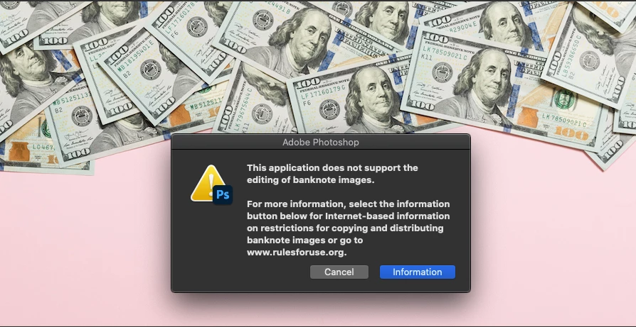 "This application does not support the editing of banknote images. For more information, select the information button below for internet-based information on restrictions for copying and distibuting banknote images or go to www.rulesforuse.org."