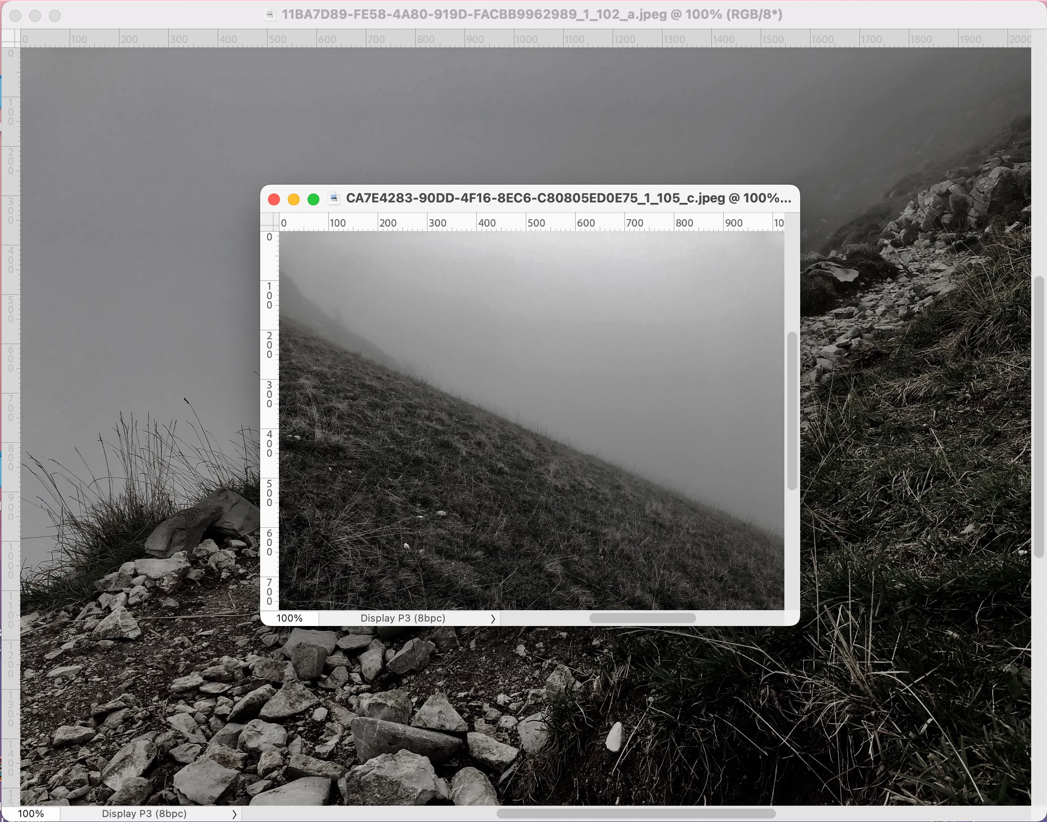 In the screenshot you can see 2 photos which opened in PS at different sizes. So strange and random. Also the file names are totally wrong, they should be: IMG_9428.JPG, IMG_9438.JPG