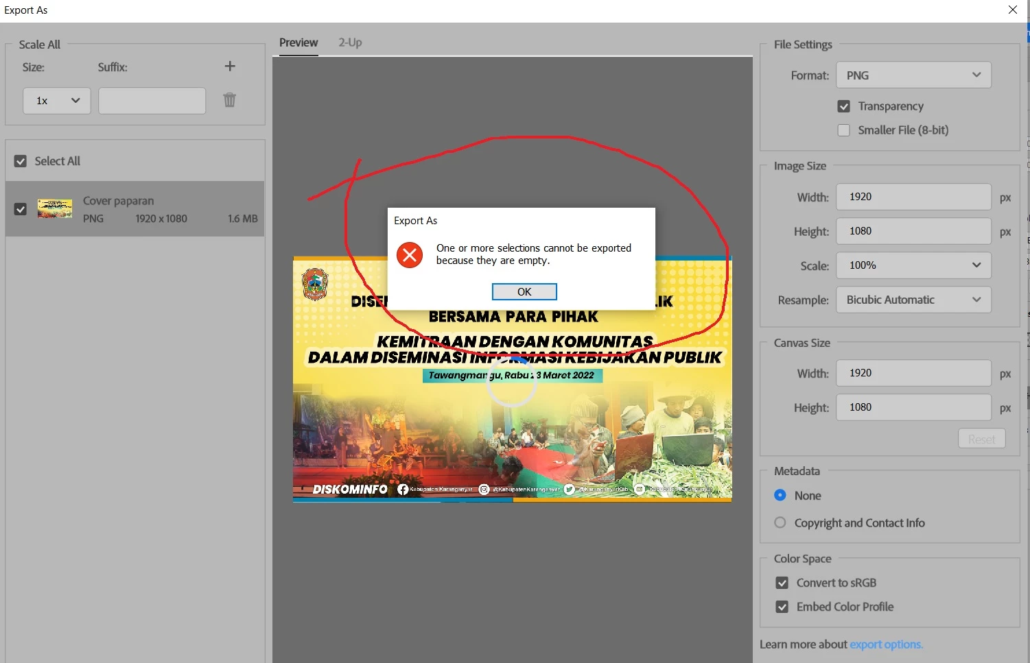 Could you please confirm if this issue is occurring with this specific file? Could you please share more screenshots with active layers or a sample file? Where is the file located, and where are you trying to export the document to an internal drive or external drive?