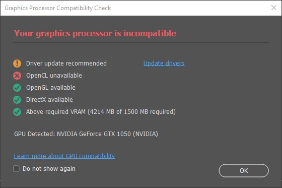 - NVIDIA GTX 1050 Driver version 472.39 (Studio Driver)