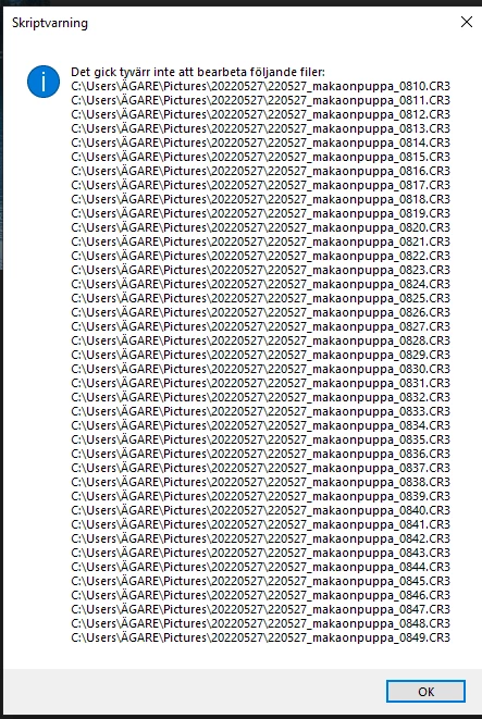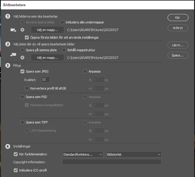 I am trying to run the image batch function via Script>Image processor to convert a dedent amount of RAW files into jpeg. Open first file is checked and then I et up the settings in the RAW editor and press OK.