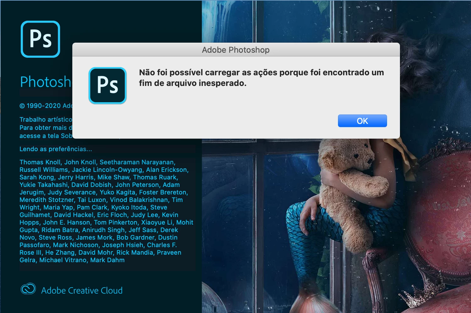 Aparece essa msg quando tento abrir o PS. Apareceu após o mac desligar por falta de bateria. Já tentei abrir vários arquivos diferentes, foto e nada. Já desinstalei e nada tbm.