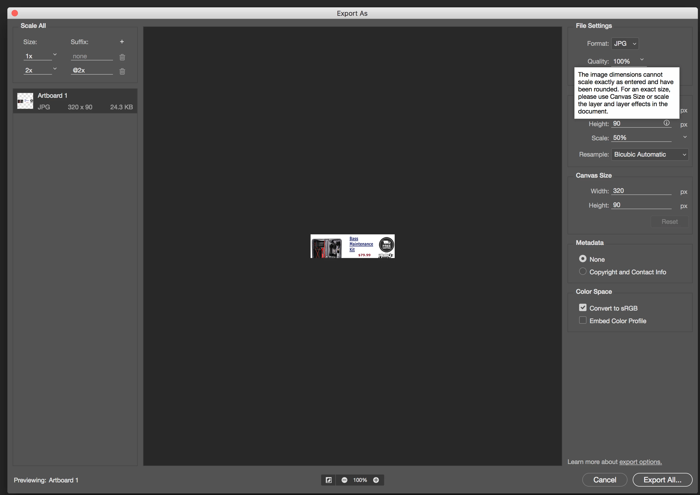 Whenever I get my 640x200 banner ready to export, I always used to scale it down to 50% (320x100) which is the 1x size for mobile (and I export a 2x version as well). Now, it will not let me export a 320x100, instead it INSISTS on exporting it as 320x90 (clipping the bottom off the banner). Screenshot attached.