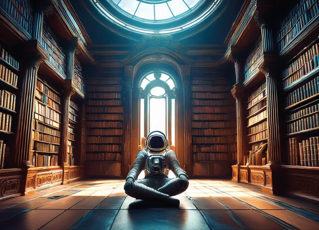 E.g. promts like: "Giant 18th century library filled with books, sculptures, fossiles, old armor, etc. and an astrononaut floating there in a sitting position. Moonlight shining through large leaslight windows."