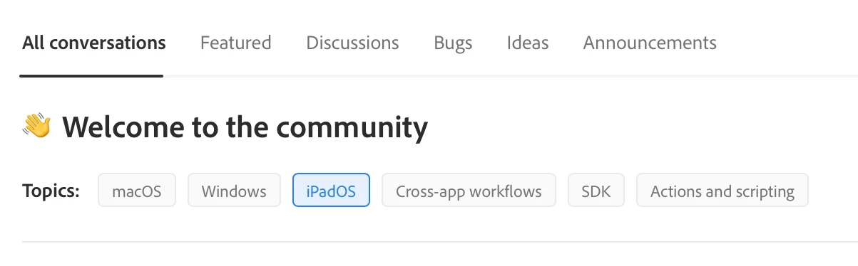 iPadOS does not have its own forum — it's part of what has been named "Photoshop Ecosystem". Have you filtered to iPadOS in the topics at the top? In addition, you can filter to Discussions, Bugs, or Ideas.