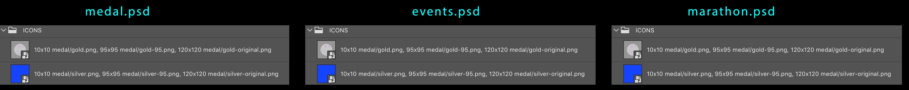 There are multiple documents (medal.psd, events.psd, marathon.psd .... etc.) with the same layer names, gold.png and silver.png. The layers have the additional @4x, @15739213, 400x400 suffixes depending on what parameters are needed.