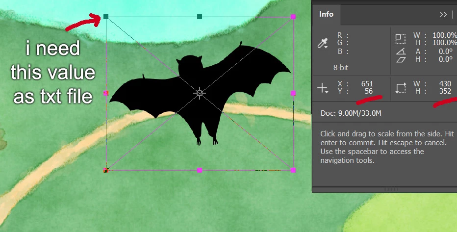 However, I can't seem to find a way / to get the top left anchor position of the transfrom bounding box. All scripts I could find use "bounds" which chopps off everything that's not visible in the layer. But I would need the actual values that do show up in the info box while working in Photoshop. Is there any way to get those values out to a text file. Batch/Script would be awesome, but any hint helps. Thanks!