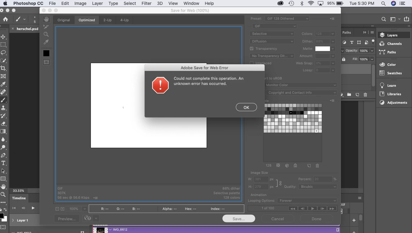 I have tried all day to save a GIF on photoshop. When I press save, a notice comes up that says "could not complete this operation. An unknown error has occured" I have re-sized the video, re-sized the canvas, updated photoshop, updated to Catallina. I decided to render the video instead and this crashed my computer three times. Can anyone help?