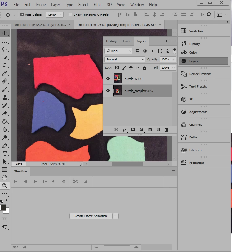 The Animation Panel is open, so hit the »Create Frame Animation« button already.