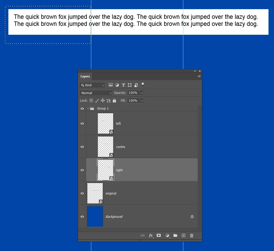Use the rectangle mmarquee tool to select each segment in turn, and copy to a new layer. I have named them left, right, and centre for convenience.