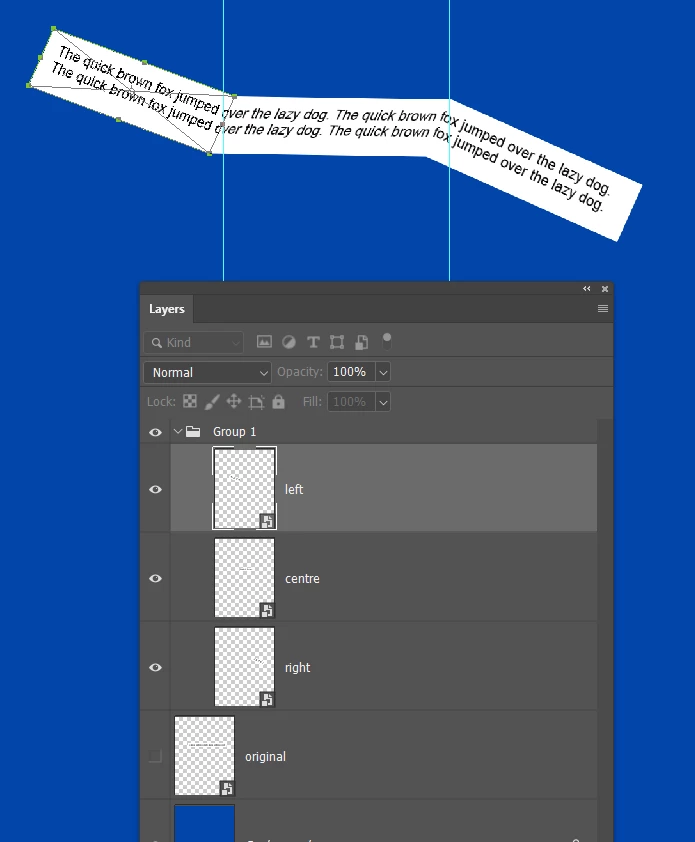 Open the group and select the Centre layer, and use the Ctrl T shortcut to start Free Transform. Because you made the layers Smart Objects, the bound box will have remained tight to the object, so hold down Ctrl (Cmd) and drag the centre left handle to drag down that side of the centre rectangle as below.