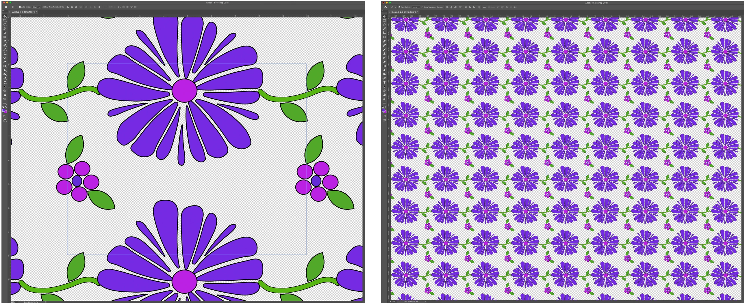 Creating seamless repeating patterns has never been easier. In the past, it was difficult to visualize how a pattern might look once it was tiled across a screen. With Pattern Preview enabled, you can see how a repeating pattern looks tiled across the screen as you design it and ensure the edges line up nicely. Create layers of images, shapes, and designs to make your pattern. Then, resize them and move them around and you will notice that all repeating instances of the the item in the pattern are immediately updated. Pretty cool, huh? Or, pick a brush and try painting a pattern. It's a simple task to make a seamless transition when you can see how the pattern looks as it repeats across the canvas. If you are working with raster layers, converting them into Smart Objects will produce the best results with Pattern Preview.