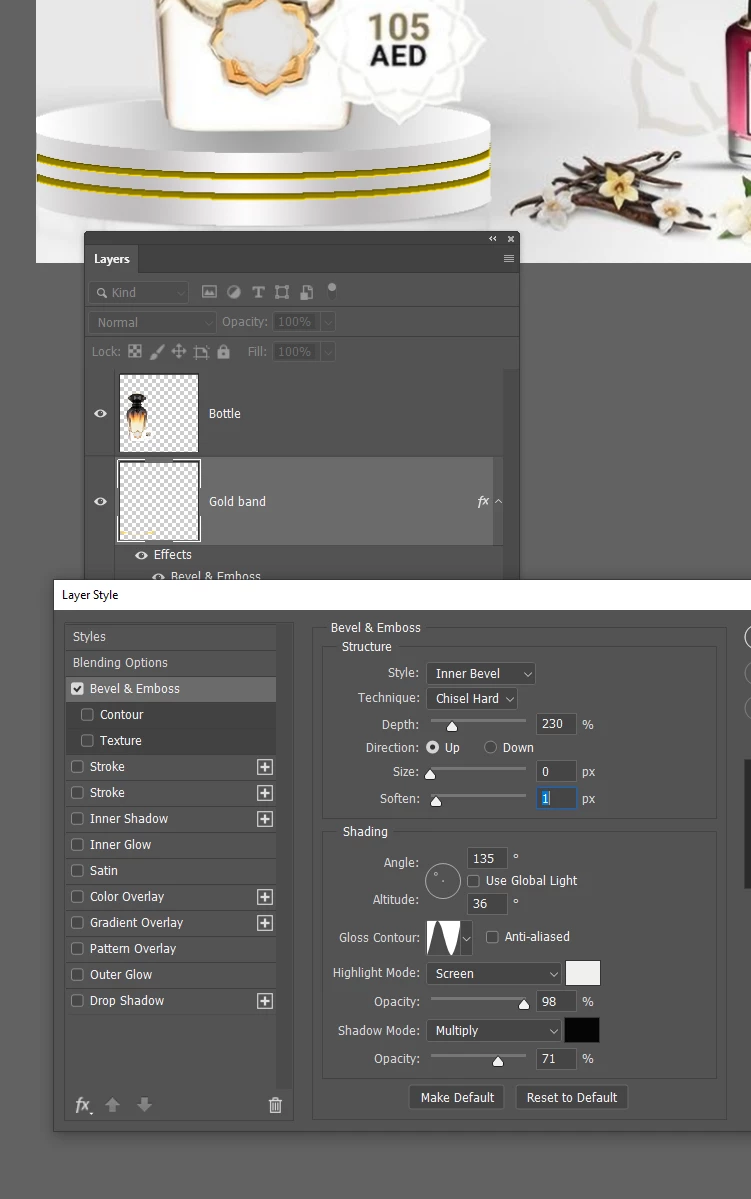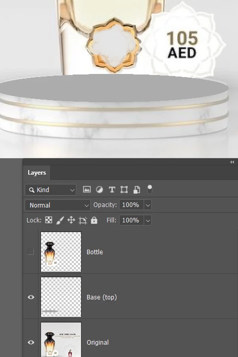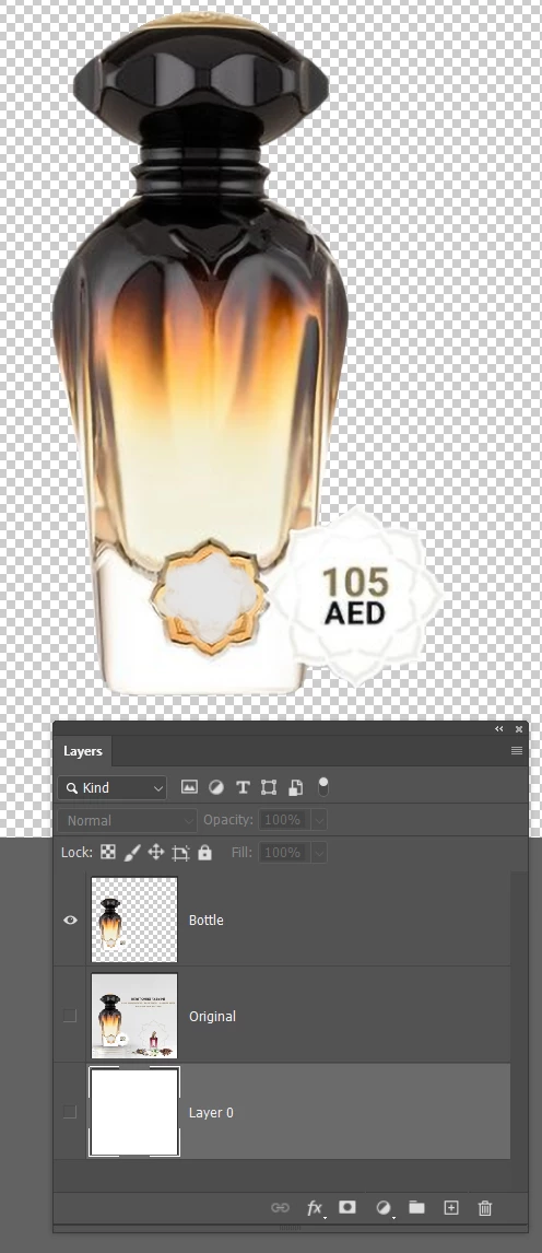 The first thing you need to do with almost any sort of composite using Photoshop is separate the image elements by selecting them, and copying to their own layer. In this case it is just the bottle.