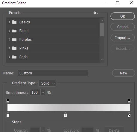This can be a tiny bit confusing, so take your time. Don't worry about the boxes above the gradient, Drag the left side lower box to the middle, and double click it which opens the colour selector. Chose a nice grey.